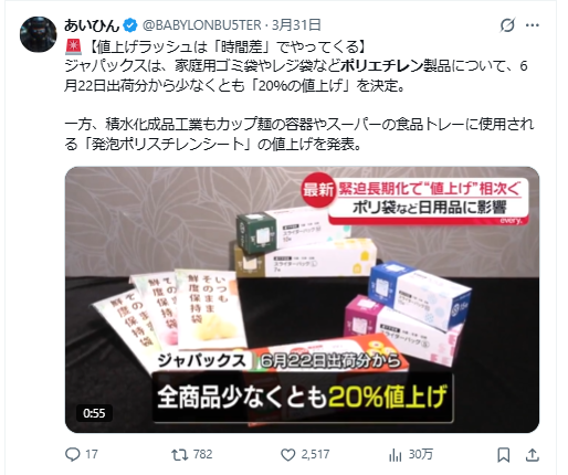 は、家庭用ごみ袋やレジ袋などポリエチレン製品について、6月22日出荷分から少なくとも「20%の値上げ」を決定。