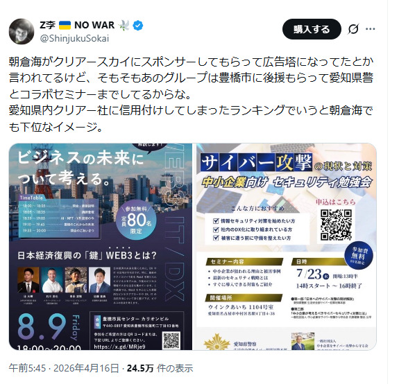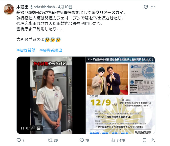 4月10日には、財界人松田哲也会長の名前や、警視庁までも、クリアースカイ社の事業に関連があるかの如く利用していたことが報じられました。